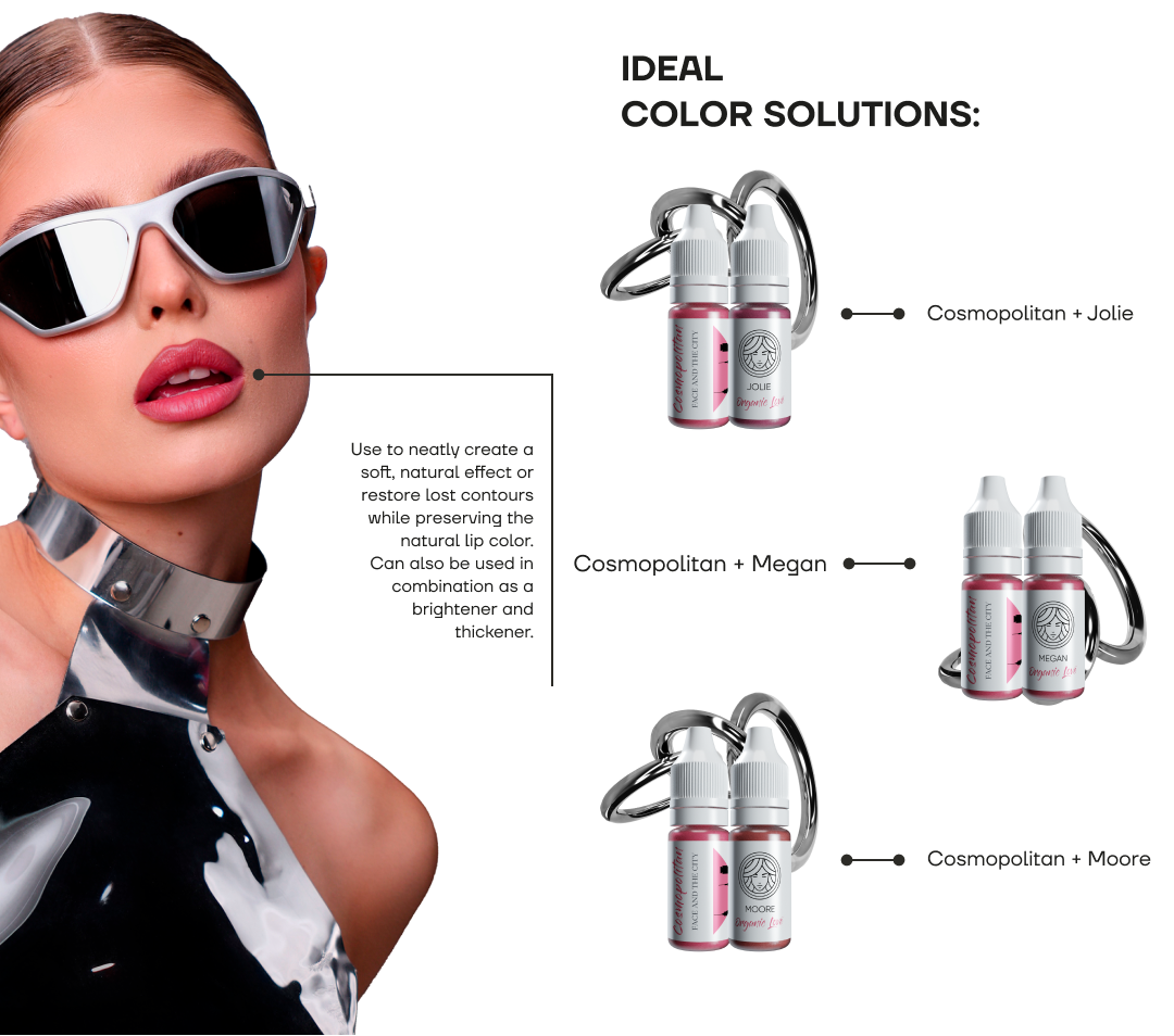 FACE Cosmopolitan is a warm pink lip pigment designed for clients with light, cool-toned skin or for neutralizing cool lips. This elegant and versatile shade provides a vibrant accent and heals with a beautiful tint effect. It can be used both on its own or combined with neutral and cool pigments to achieve the desired tone and depth. Ideal for creating soft yet expressive lip looks that maintain a natural glow after healing.